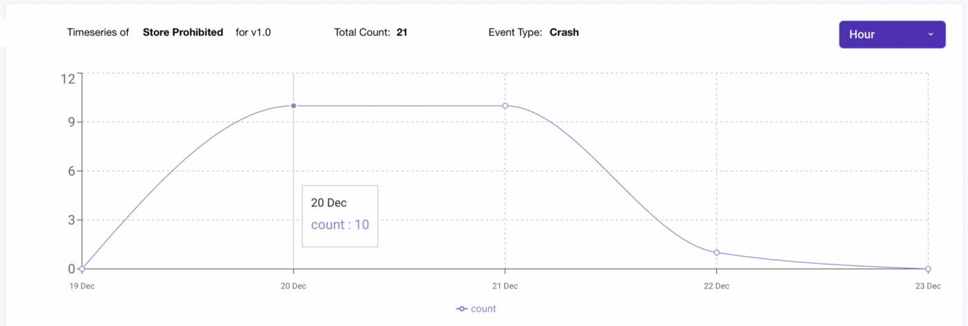 - Counts, grouped by events (e.g., “errors”), in a particular project or version, at a selected time frame, ranging from hourly, to weekly or monthly ones.