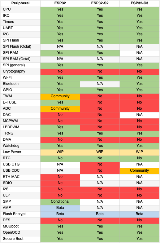 While peripheral support is not the only task for supporting an RTOS, it is among the most important ones. ESP32 devices are resourceful, but it always takes much effort to get them fully supported. This is why we are truly grateful to those developers from the Zephyr community, who decided help us port some peripherals. Thus, the current porting status of the ESP32 family is as follows: