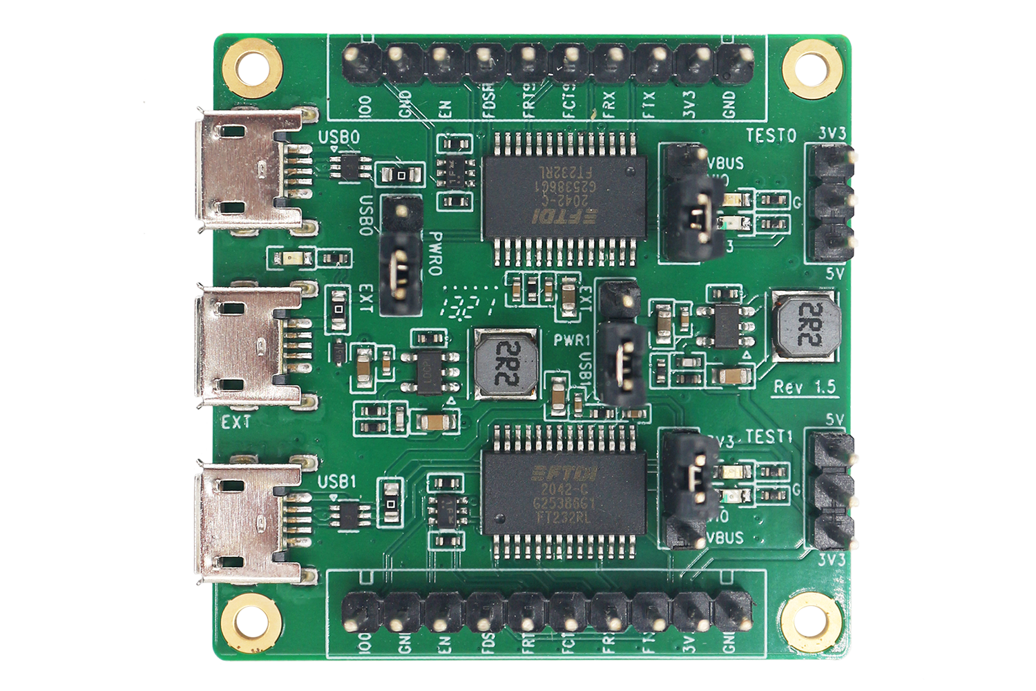 Designed for mass production and testing, this stable and compact production testing board works as a serial port board that provides two high-speed serial ports and a USB port that allows external power supply.