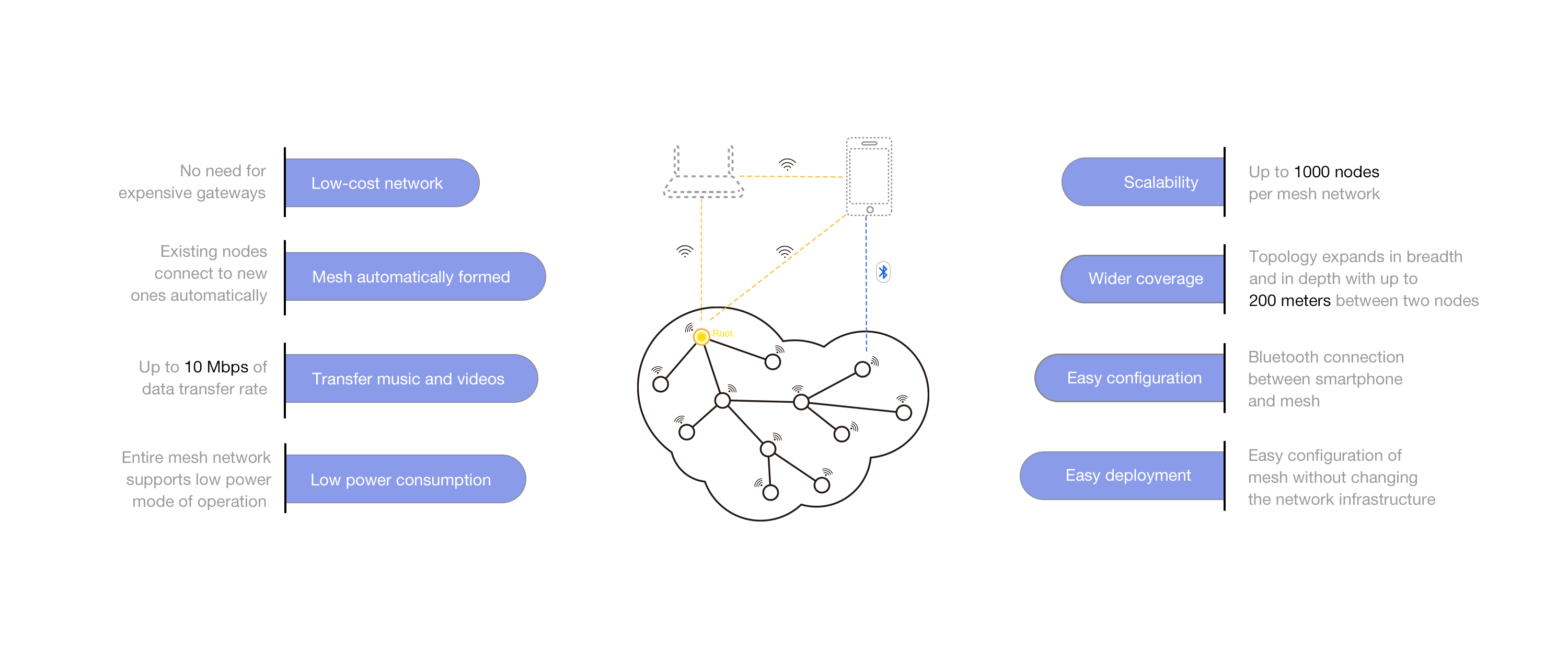 Typically other mesh networks require additional mesh infrastructure equipment to cover wider areas. ESP-WIFI-MESH does not require any additional equipment to form a network. It also scales well with a low-capacity Wi-Fi access point, since the access point is completely unaware of the existence of ESP-WIFI-MESH nodes.