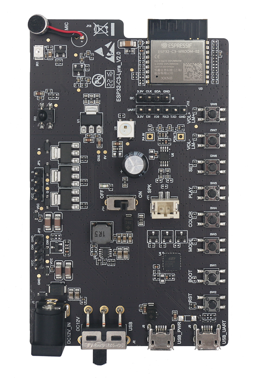 ESP32-C3-Lyra is an ESP32-C3-based audio development board produced by Espressif for controlling light with audio. The board has control over the microphone, speaker, and LED strip, perfectly matching customers’ product development needs for ultra-low-cost and high-performance audio broadcasters and rhythm light strips. |