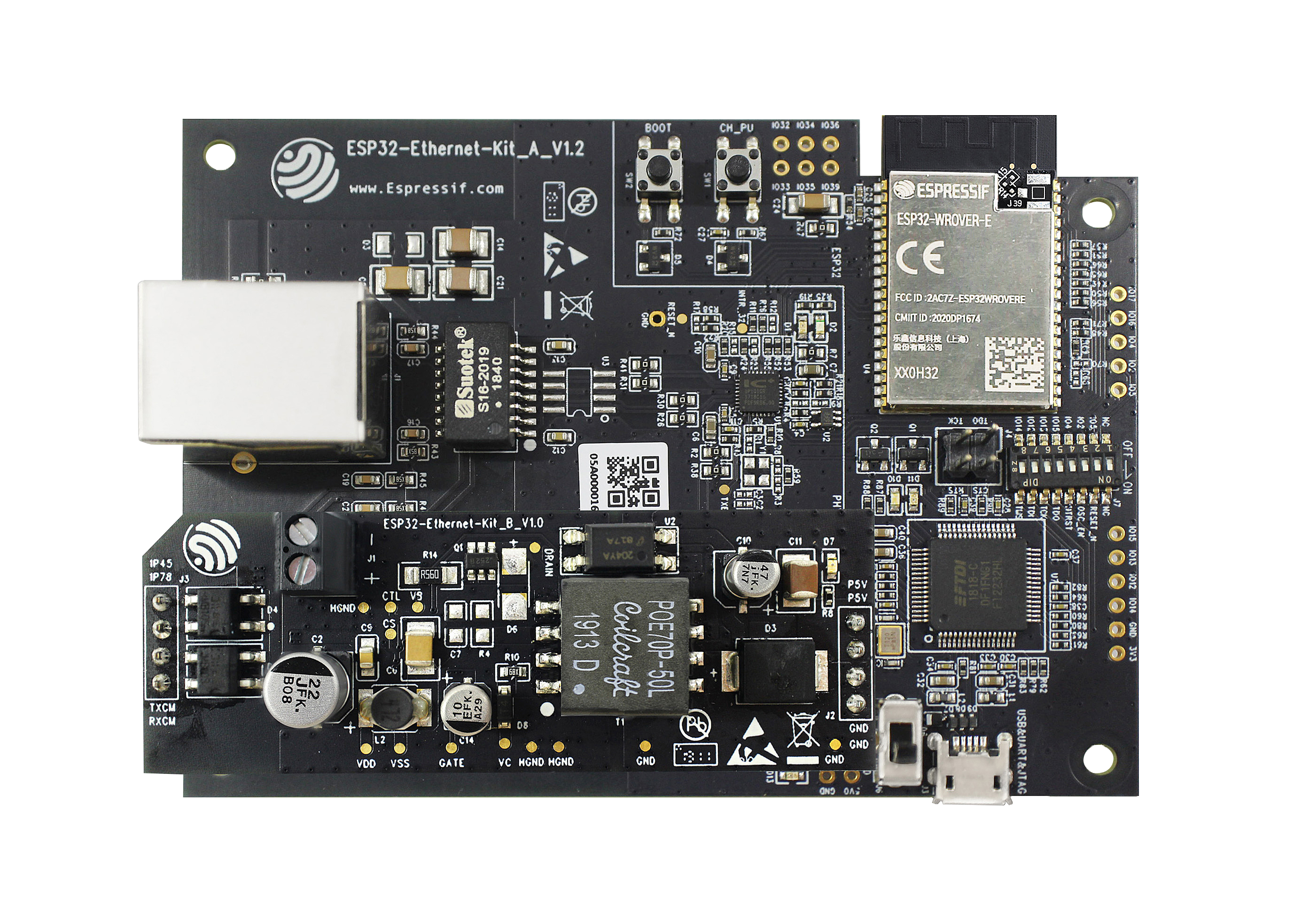 ESP32-Ethernet-Kit is an ESP32-based development board produced by Espressif. It consists of two development boards, the Ethernet board A and the PoE board B, The Ethernet board contains Bluetooth / Wi-Fi dual-mode ESP32-WROVER-E module and IP101GRI, a Single Port 10/100 Fast Ethernet Transceiver (PHY). The PoE board (B) provides power over Ethernet functionality. The A board can work independently, without the board B installed. |